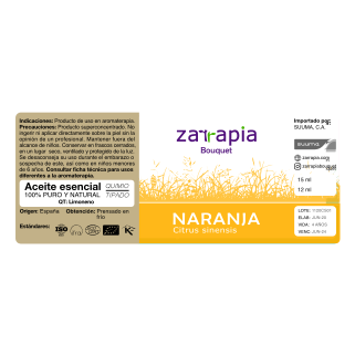 Precauciones: Producto superconcentrado. No ingerir ni aplicar directamente sobre la piel sin la opinión de un profesional. Mantener fuera del alcance de niños. Conservar en frascos cerrados, en un lugar seco, ventilado y protegido de la luz. Se desaconseja su uso durante el embarazo o sospecha de este, así como en niños menores de 6 años. Consultar ficha técnica para usos diferentes a la aromaterapia.