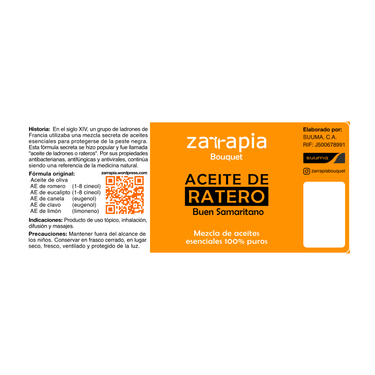 Precauciones: Producto superconcentrado. No ingerir ni aplicar directamente sobre la piel sin la opinión de un profesional. Mantener fuera del alcance de niños. Conservar en frascos cerrados, en un lugar seco, ventilado y protegido de la luz. Se desaconseja su uso durante el embarazo o sospecha de este, así como en niños menores de 6 años. Consultar ficha técnica para usos diferentes a la aromaterapia.